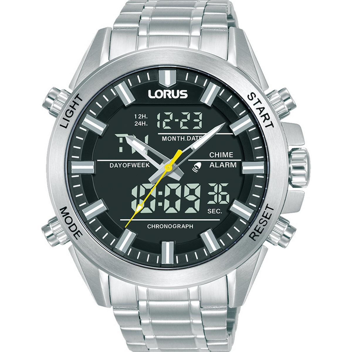 LORUS QUARTZ DUO DISPLAY GENTS STAINLESS STEEL BLACK DIAL BRACELET WATCH