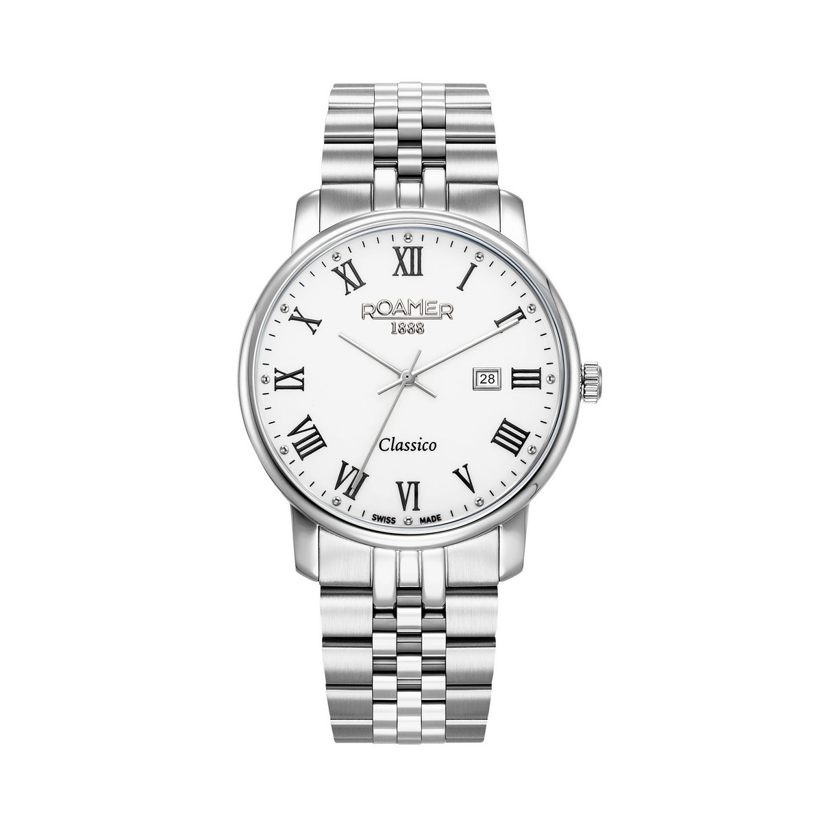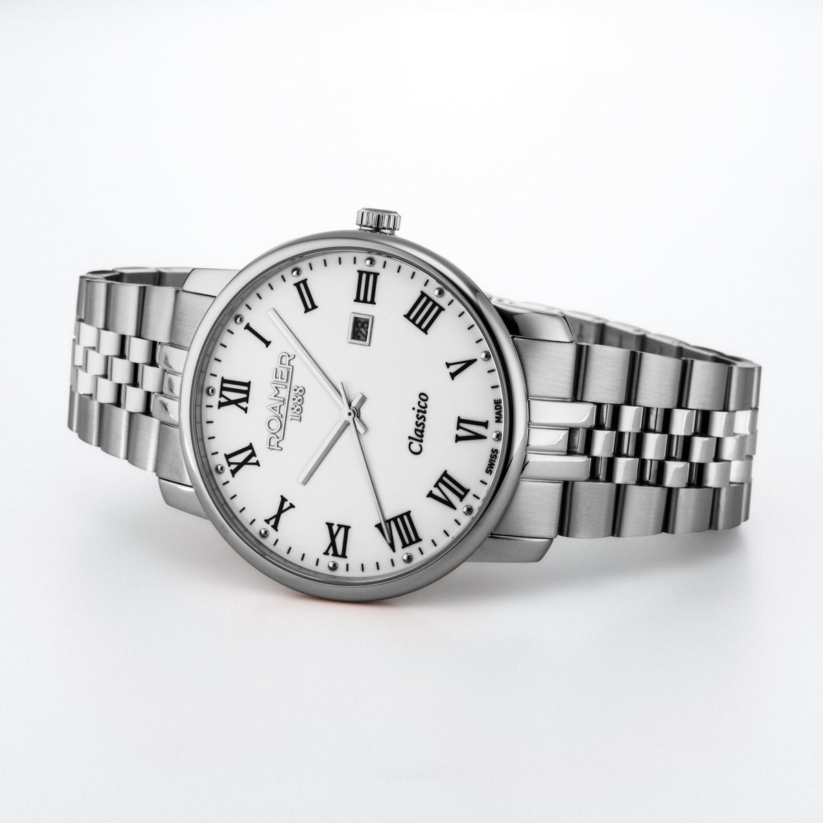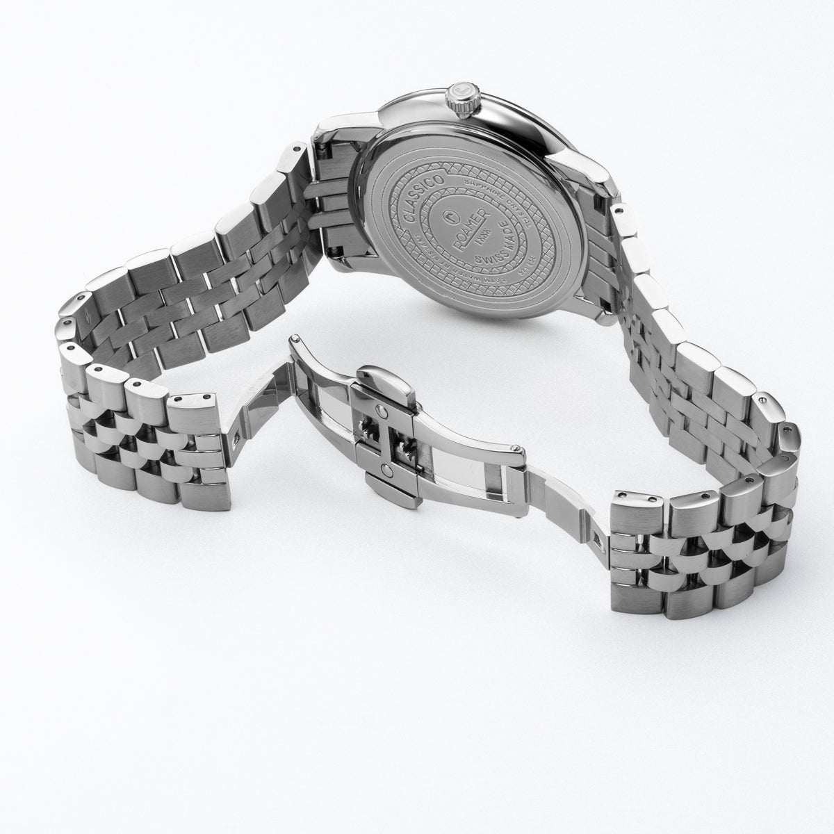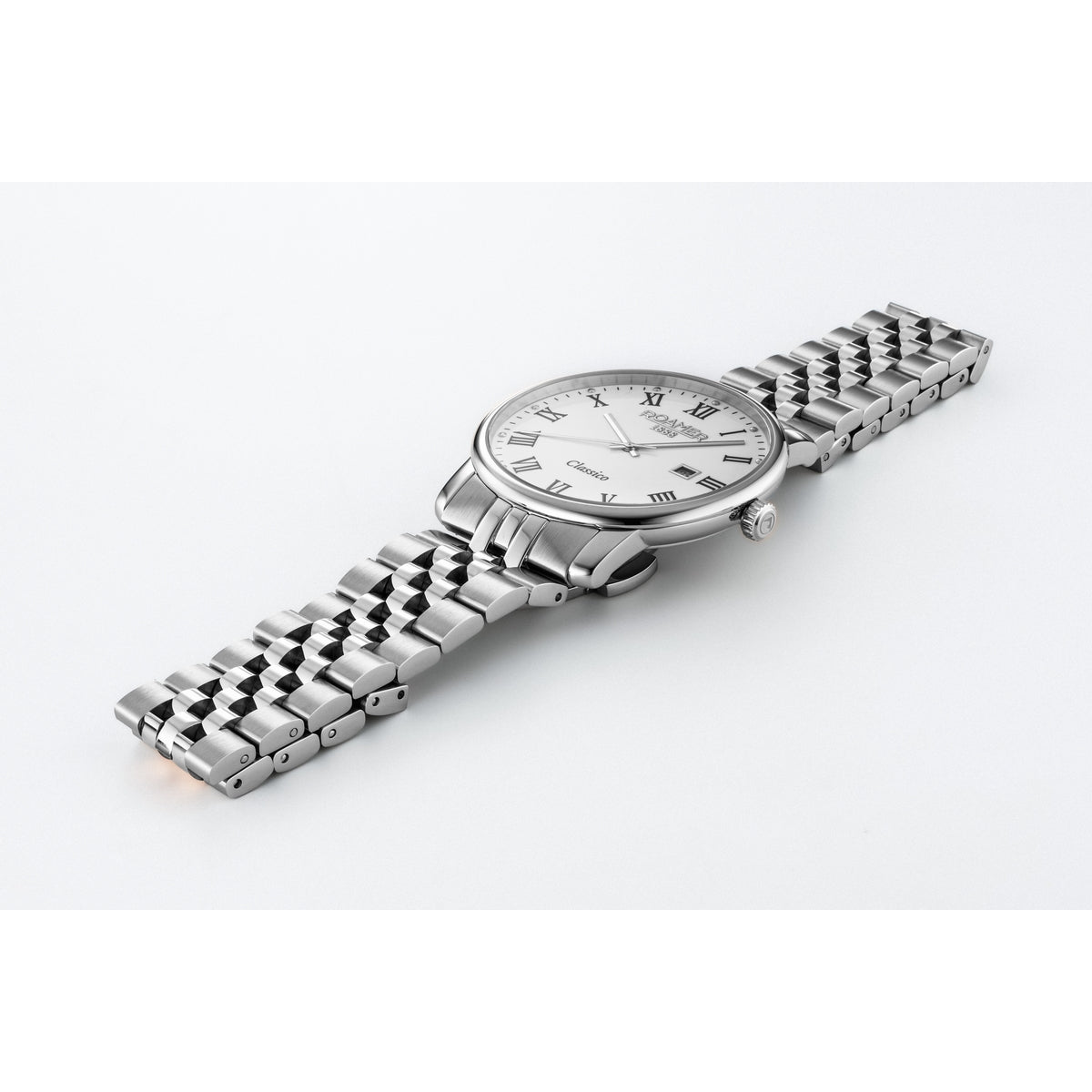 MOVEMENT TYPE: Quartz MOVEMENT CALIBRE: RONDA 705 BAND TYPE: Stainless Steel Bracelet CLASP TYPE: Deployment DIAL COLOUR: White WATER RESISTANCE (Metres): 30 CASE WIDTH: 40mm CASE DEPTH: 7mm GLASS TYPE: Sapphire Crystal DATE FUNCTION: Date Only STONE TYPE: